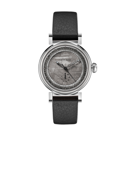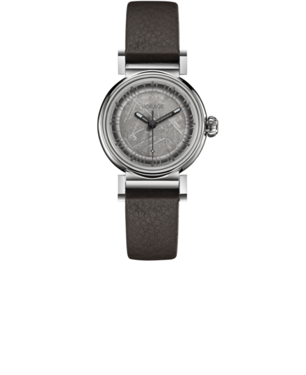 Solar Winds brilliantly polished or satin finished sleek steel case frames a natural meteorite work of art, whilst the smooth Swiss handmade calf leather strap snugly embraces your wrist.