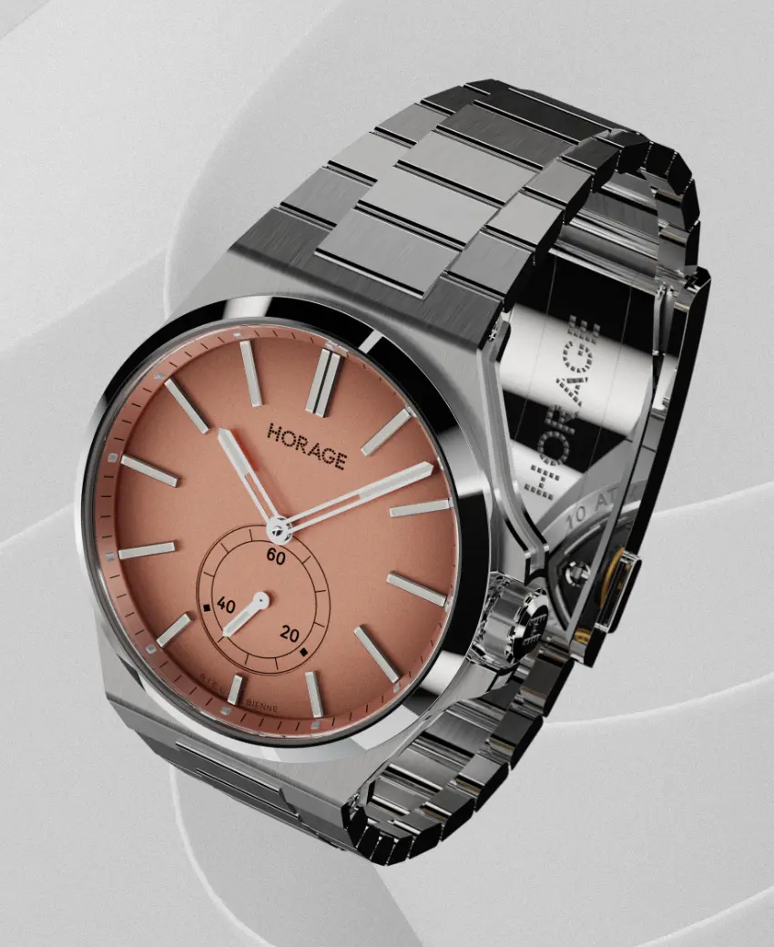 表盘:鲑鱼色或渐变烟灰色,钻石切割镀铑银色抛光时标,时标上涂覆瑞士超级夜光涂层(Super LumiNova®),Horage 标志,6 点钟位置的小秒针表盘
