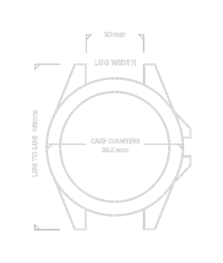 尺寸:錶殼直徑38.5毫米,錶耳寬度20毫米,錶耳間距46毫米。