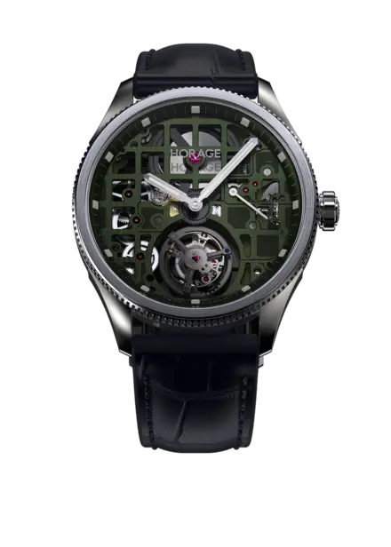 錶盤:鏤空K-TOU機芯,飾有HORAGE方形紋飾,提供三種配色,薄荷蘇打、泰加冷杉綠和精準紫。錶盤外圈設有5分鐘刻度的立體鑲貼時標,採用雙層瑞士 Super-LumiNova™️ 夜光塗層,呈現綠色夜光效果。