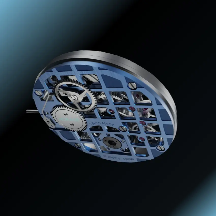 K-TOU is a manual-wind movement with a unique aesthetic. There are “dial grids” integrated in both the front and back, which were customizable online. They came in silver, grey, gold, blue and a blue/grey combo (blue in back, grey in front), and the pattern is a signature HORAGE style inspired by our logo. It had a mostly skeletonized design with open and closed “windows” throughout the grids. The square sections have a 30-degree polished bevel and the closed sections are recessed and bead-blasted. The barrel and mainspring are clearly visible just right of 12 o’clock and act as an approximate power reserve indicator. Of course, the star of the show is at 6 o’clock where the flying tourbillon sits in a 14mm aperture. The 43-piece tourbillon cage uses a stable ball bearing construction in lieu of the traditional pinion and jewel design, which contributes to durability and allows for reliable daily wear (tourbillons are known to be fragile). The time-only K-TOU has a jewel count of 19, which is above the “fully jeweled” threshold of 17 and the optimal number for a lifetime of performance. As always, accuracy is within the COSC standard of -4/+6 seconds per day and an official COSC certificate was configurable option.