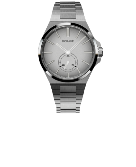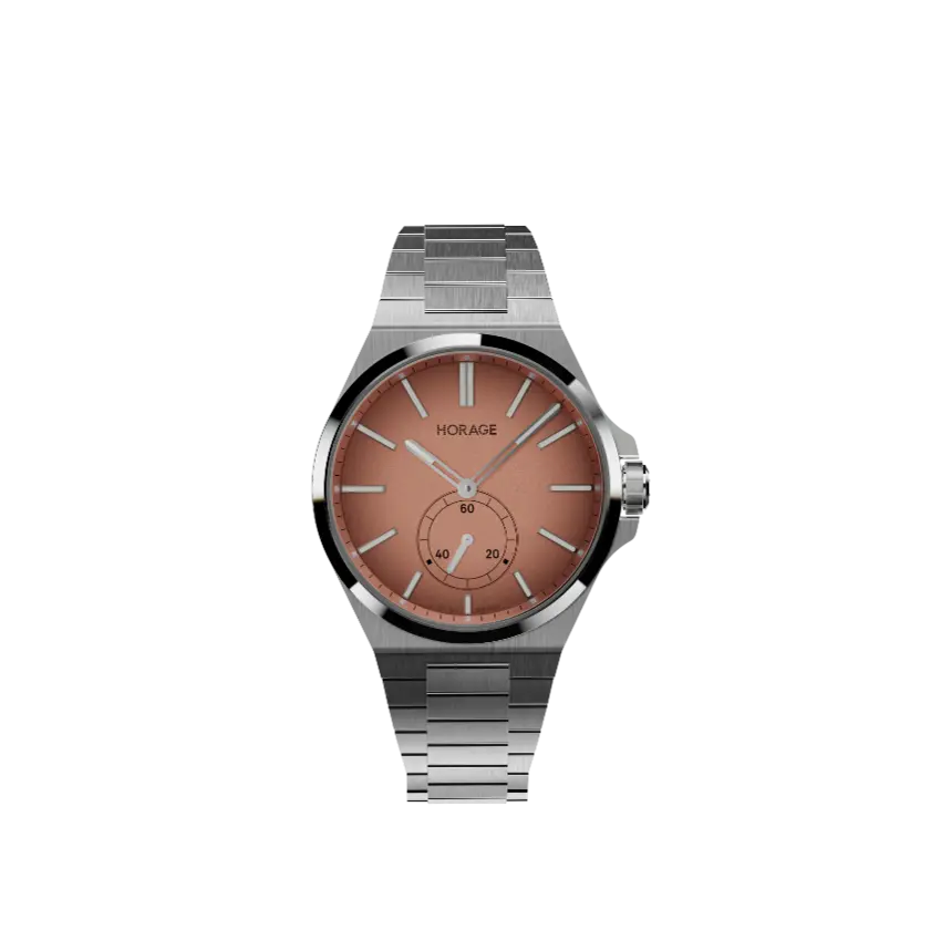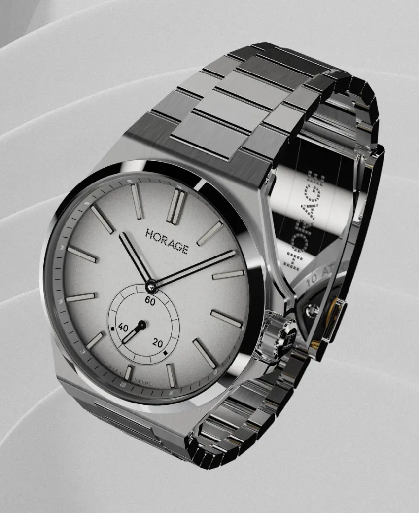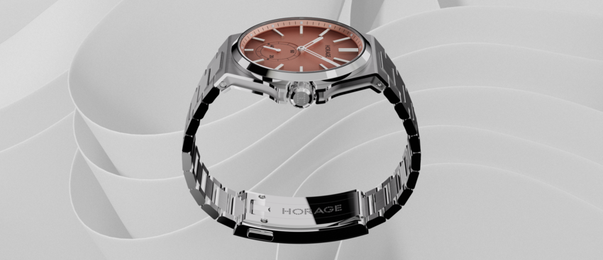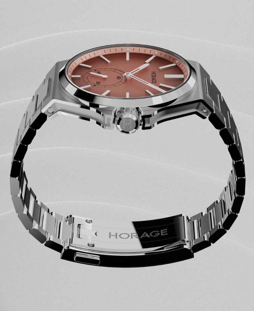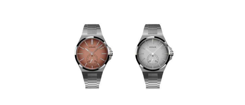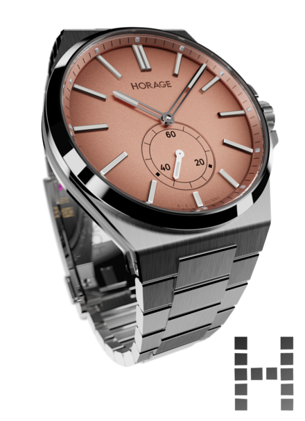 表盘:鲑鱼色或渐变烟灰色,钻石切割镀铑银色抛光时标,时标上涂覆瑞士超级夜光涂层(Super LumiNova®),Horage 标志,6 点钟位置的小秒针表盘