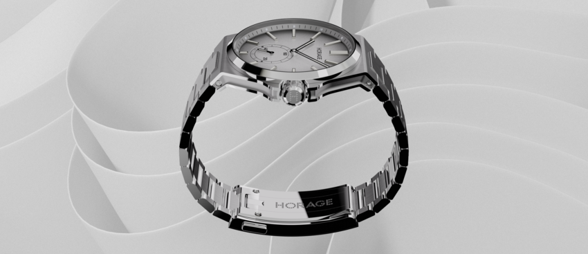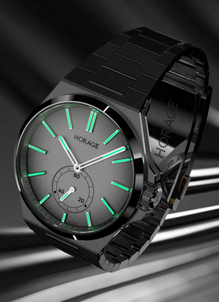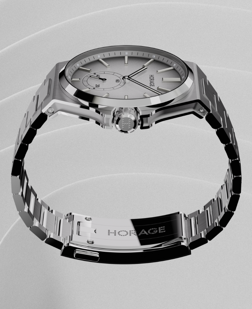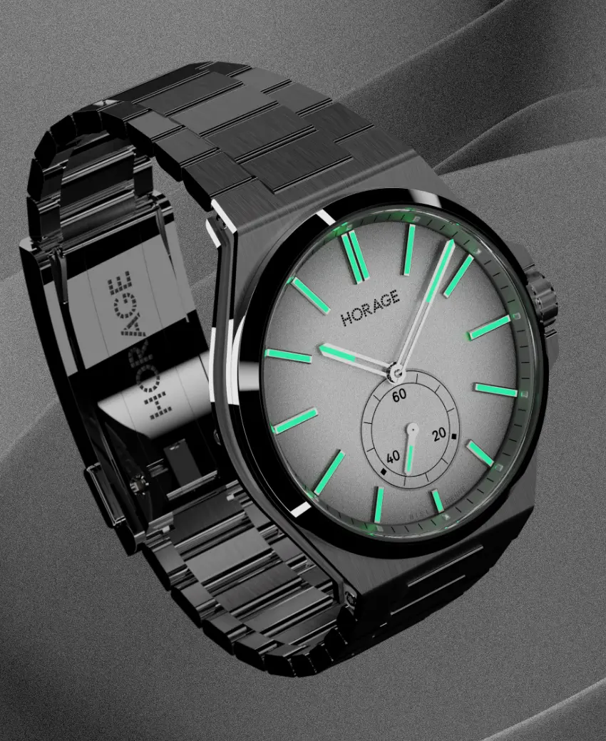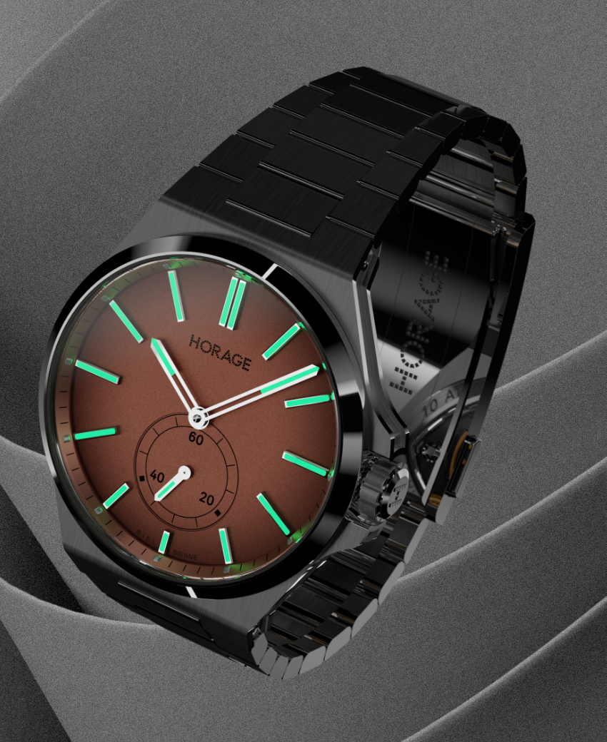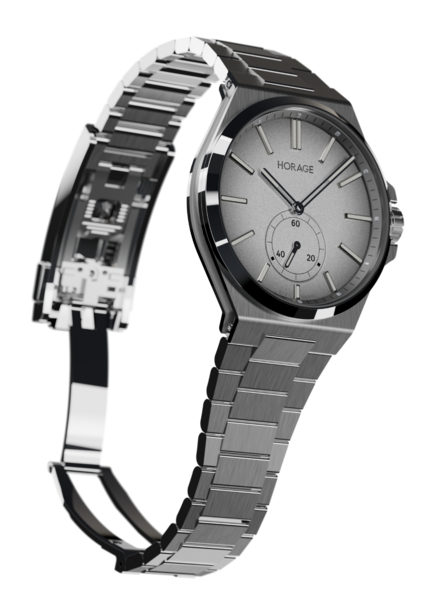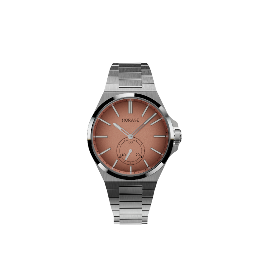 表盘:鲑鱼色或渐变烟灰色,钻石切割镀铑银色抛光时标,时标上涂覆瑞士超级夜光涂层(Super LumiNova®),Horage 标志,6 点钟位置的小秒针表盘
