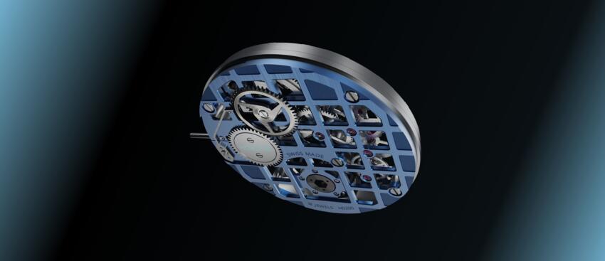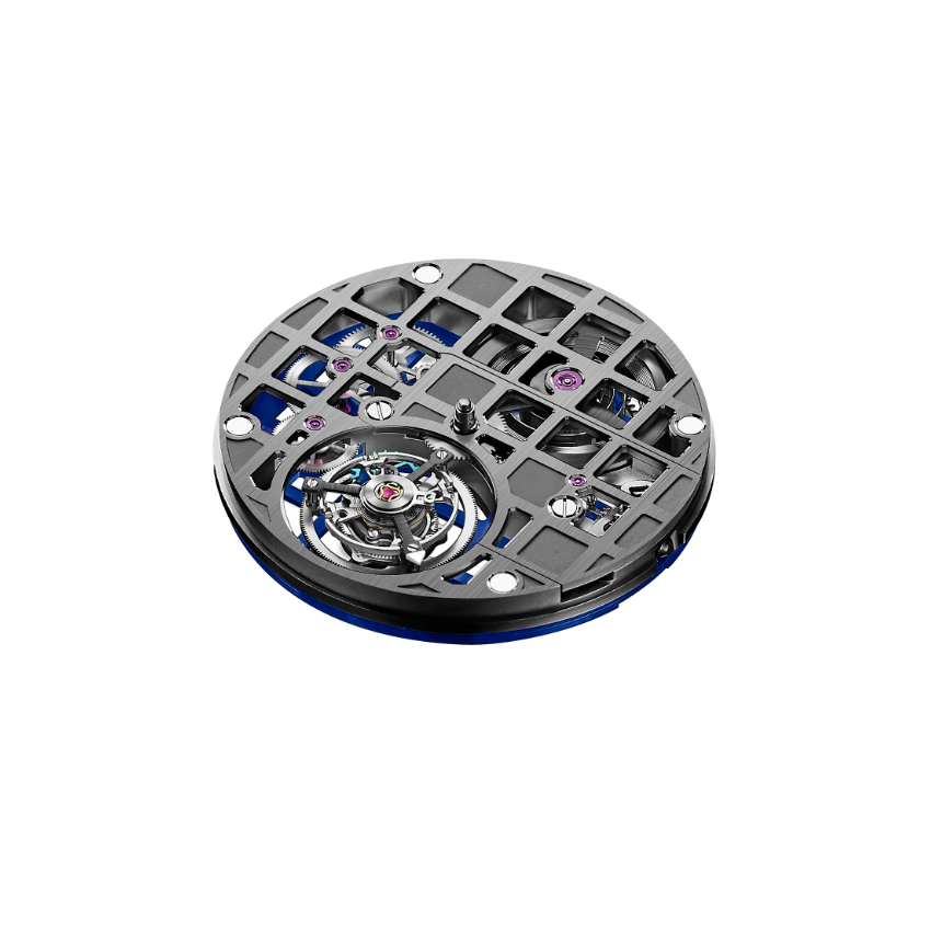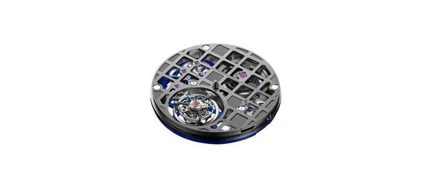 K-TOU是一款具有独特美感的手动上链机芯。正面和背面都以镂空网格组合,共有银色、灰色、金色、蓝色和蓝/灰色组合(背面蓝色、正面灰色)五款,可于预购时在线订制,风格设计启发来自品牌 HORAGE 标志。主要的镂空设计,在整个网格中都有打开和关闭的窗口,打开的方形部分有一个三十度角的抛光斜面,关闭的部分是低凹并经过喷砂处理。于十二点钟位置清晰可见发条盒和发条,可当作类似的动力储存指示。当然,表演的主秀位在六点钟位置,飞行陀飞轮座落于直径十四毫米的光圈里。陀飞轮笼共有四十三个零组件,以稳定的滚珠轴承结构代替传统的小齿轮与宝石的设计,这有助于提高耐用性同时提供日常佩戴的可靠性( 陀飞轮的易碎是众所周知 )。 K-TOU 一共使用十九颗宝石,高于完全宝石的门槛数目十七颗,即性能寿命的最佳数量。同样地,精准度在每天 -4/+6 秒的 COSC 瑞士官方天文台标准范围内,可加价选购COSC瑞士官方天文台证书。
