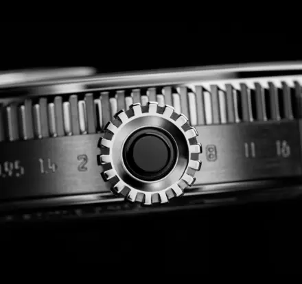 表壳的美学灵感来自相机镜头的光圈环。机身用激光蚀刻出f/0.95光圈环的标记。f/0.95的镜头非常罕见,低于f/1.0的镜头都是世界上光圈最大的镜头之一。