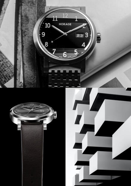 Omnium的904L不锈钢表壳可以搭配白色 、黑色或太阳纹黑金表盘,耀眼的5层蓝宝石切割表镜面衬托着大三针和大日历窗。另外在表底盖可以透过蓝宝石镜面看到机芯自动陀上雷雕的HORAGE标志。